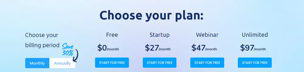 The Webinar plan costs $47 per month and includes all of the features of the Startup plan, plus the ability to create and host webinars. This plan is ideal for businesses that want to engage with their audience through webinars.